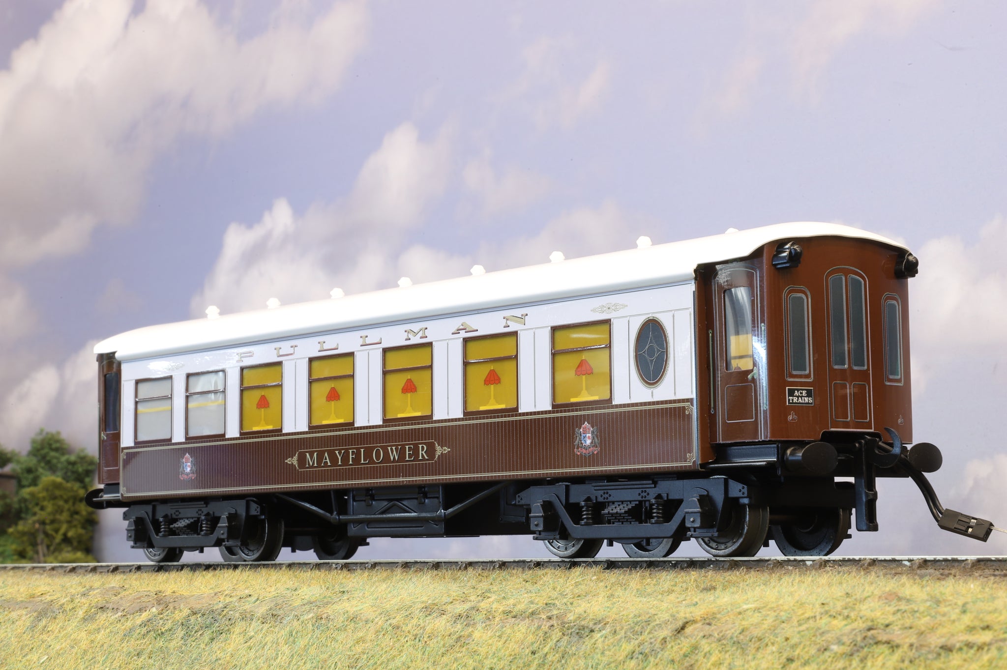 Another unusual model form ACE Trains (item no. C/26PM), this coarse scale Pullman-style coach is decorated in umber and white and is in mint condition.