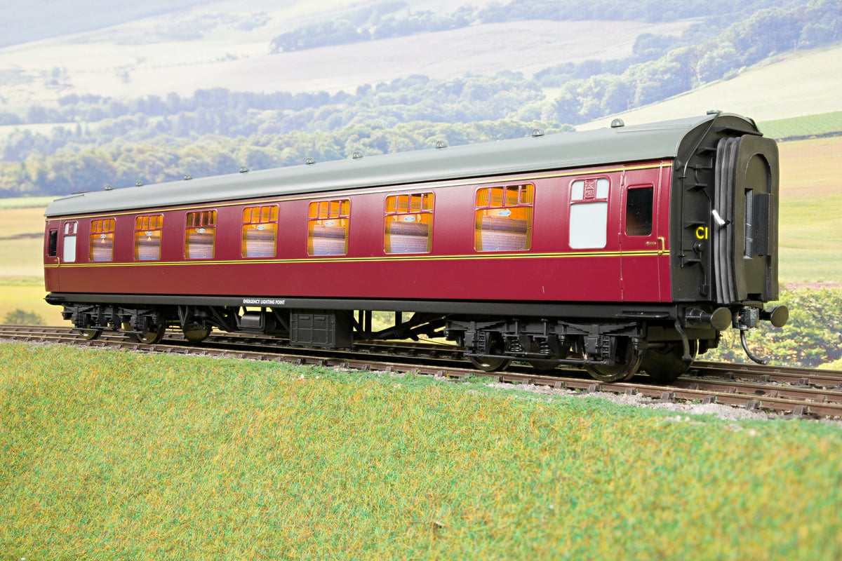 One of the award winning Darstaed mainline Mk1 coaches, with this example finished in BR lined maroon livery.