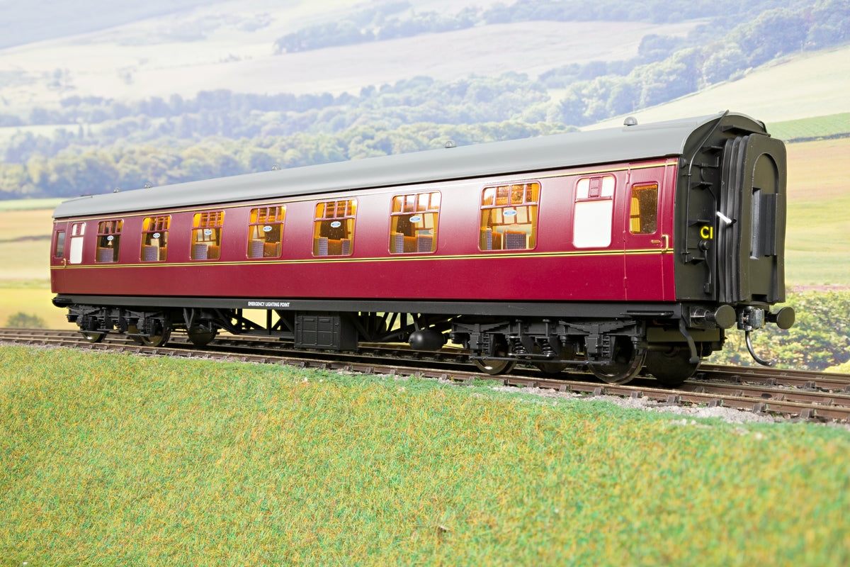 One of the award winning Darstaed mainline Mk1 coaches, with this example finished in BR lined maroon livery.