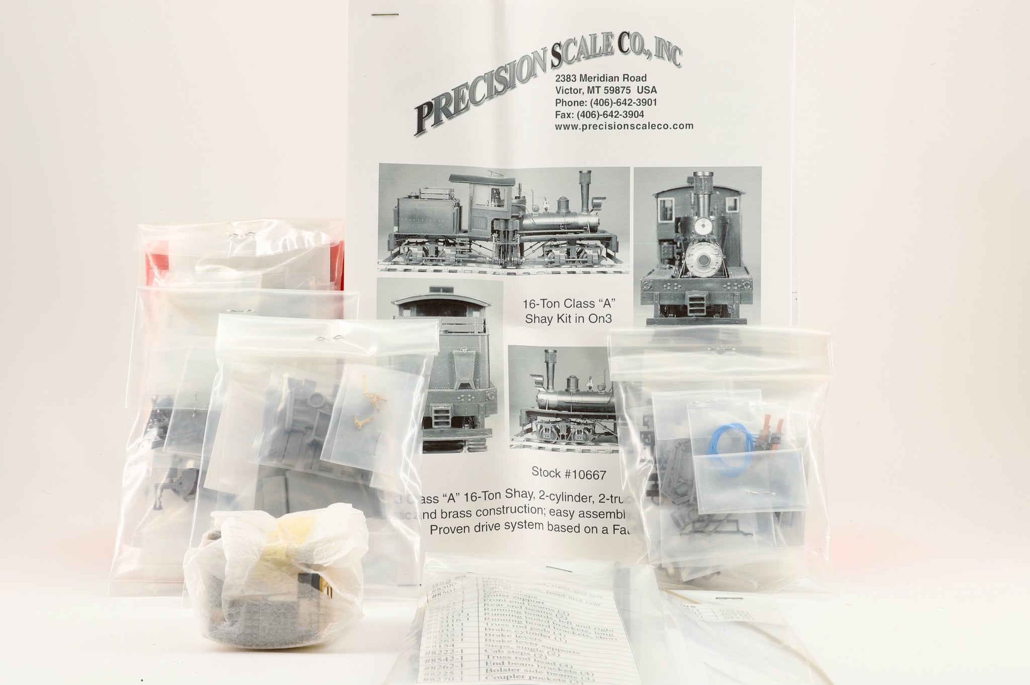 A complete, unstarted On3 kit of a 2-truck Class A Shay, comprised primarily of plastic components. The kit requires a motor to complete.