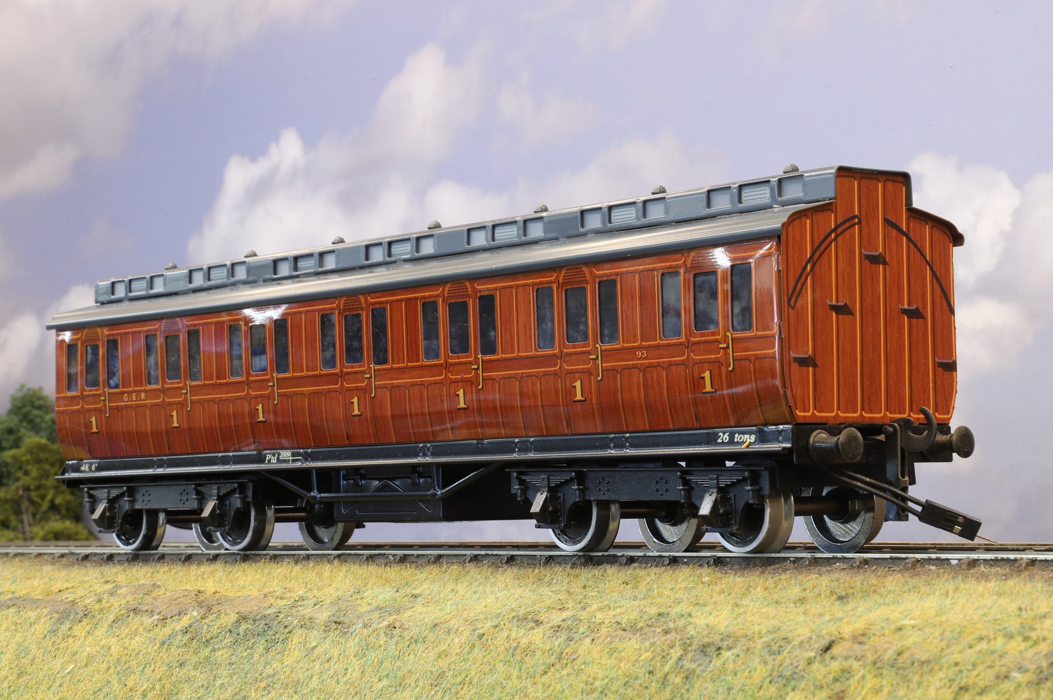 A Darstaed Coarse Scale O Gauge GER Non-Corridor First Coach, with decorated interior.