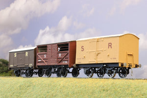 This rake of Southern Railway vans includes two closed-sided examples (8T and 10T) and an open-sided horse box (with horses).