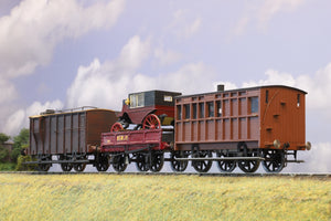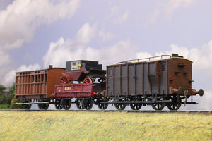 Put together here is a Victorian / Edwardian private train comprising of a four wheel coach, luggage van and four wheel flatbed complete with a private horse drawn carriage.