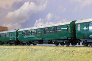 This Ace Trains Southern Railway coach set (C/21-B)comprises First, Composite and Brake Third coaches. The vehicles are in mint condition and fitted with pickups and through wiring for lighting when used on 3-rail systems.
