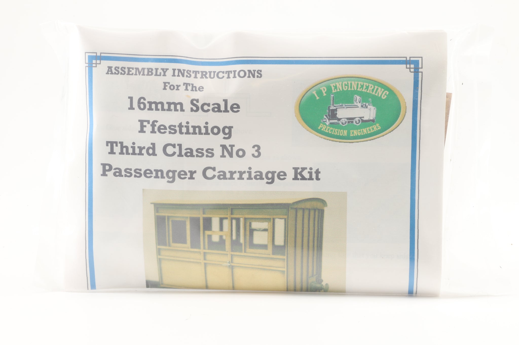 An unstarted kit of wooden parts to make a Ffestiniog Railway Third Class passenger coach. Requires wheels to complete.