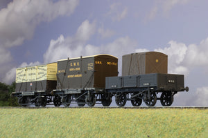 From unknown kits and of plastic construction an excellent rake of two conflat wagons and one open wagon with loose container. Very well made one of the conflat containers is secured with chains.