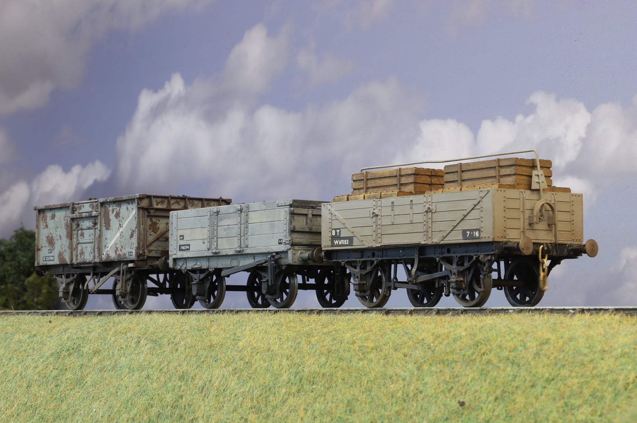 From plastic kits including one from Coopercraft, three BR era wagons. Both five planks have loads, one coal, one wooden crates, the mineral wagon has a coal load. All are weathered.