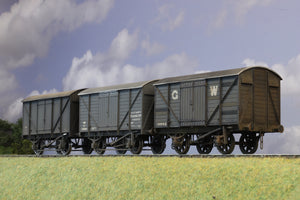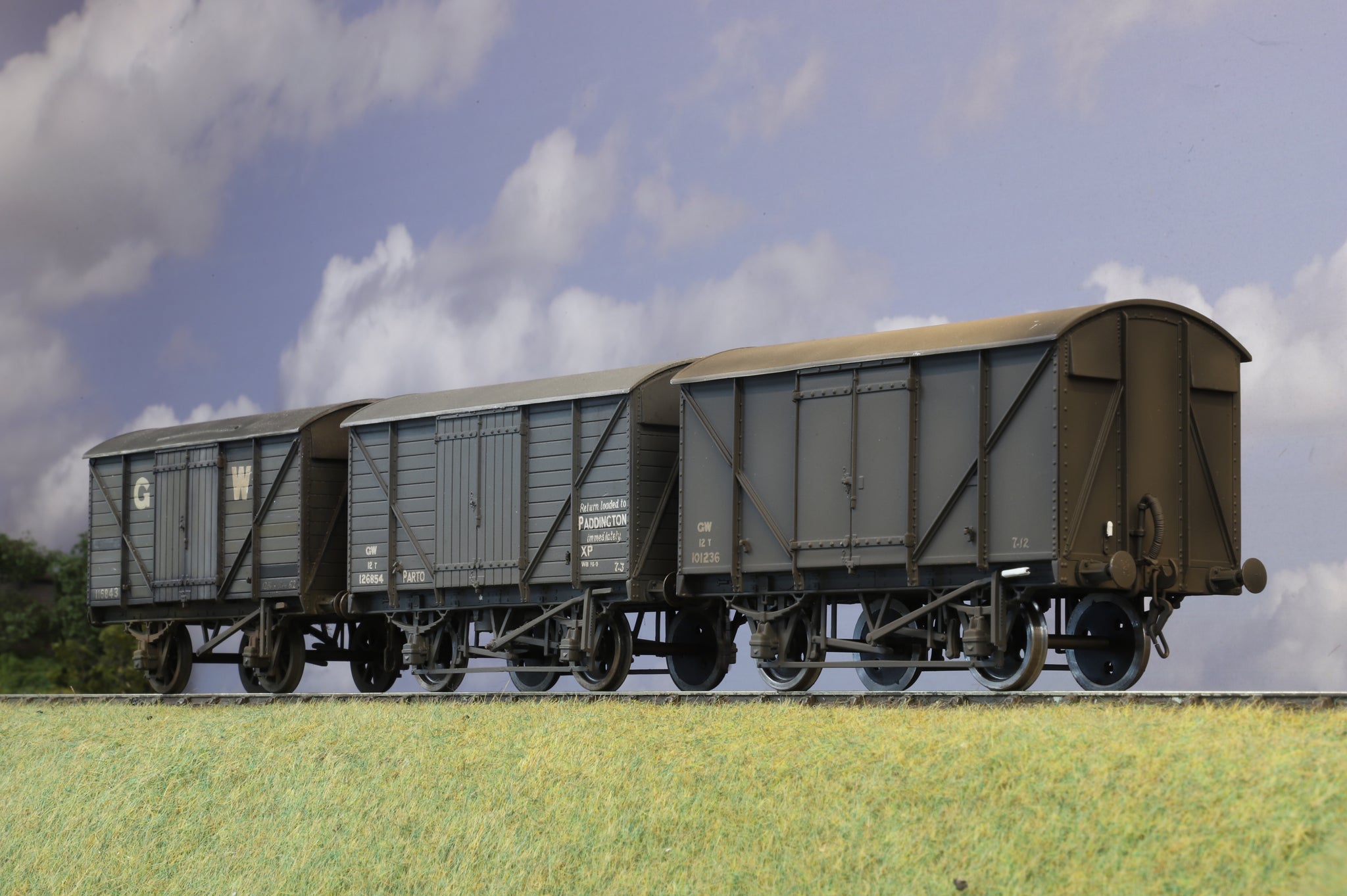 From unknown kits and of plastic construction a trio of Great Western Vans. Very well-made and painted in a grey livery with a light weathering.