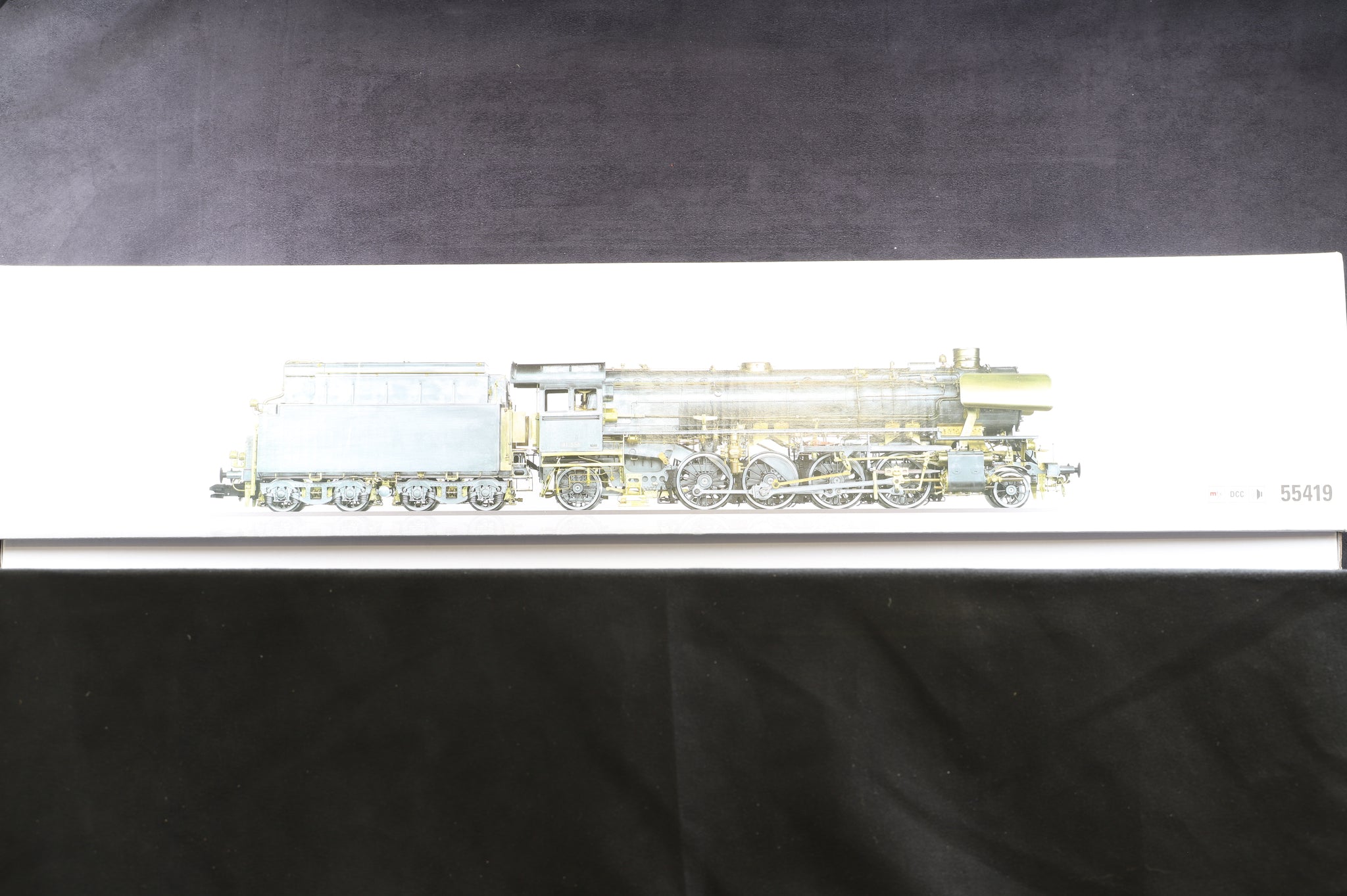The loco is in excellent overall condition. The roof strip trim has been re-attached and a couple of minor detailing pieces have been very slightly bent. Furthermore, the supports for the steam deflectors are also slightly bent. The box is in excellent condition with some minor shelf ware. Comes complete with paperwork and detailing packs. The display case is also in mint condition. |